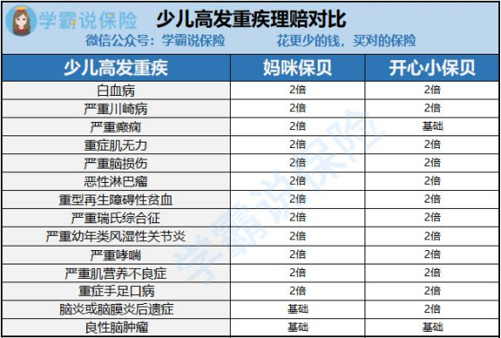 虽然妈咪保贝和开心小保贝的病种覆盖都差不多,赔付的比例也都是翻倍赔付,但是仔细一看,还是能发现有很大差别的。