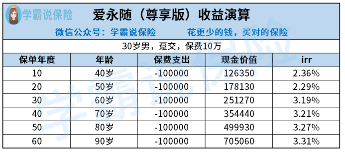 如果说以上提到的仅仅只是爱永随终身寿险的小缺陷的话,在算完爱永随终身寿险的真实收益之后,恐怕各位就要倒吸一口凉气了。