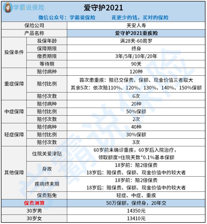 接下来才是重头戏,学姐将带来天安人寿热卖的重疾险——爱守护2021的详细测评,一起来看看吧~
