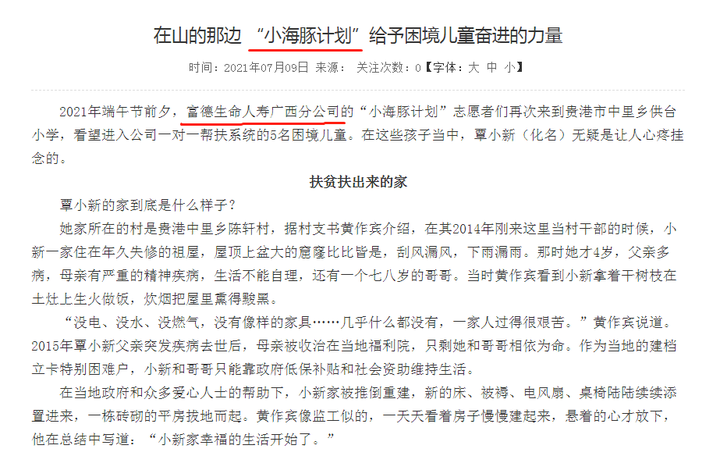 “小海豚计划”是富德生命人寿广西分公司正在进行的一个项目,主要是针对那些处在困境中的儿童给予爱的力量,比如覃小新(如上图),像这类扶贫的举动,肯定会引起社会人士的关注,同时也为富德生命人寿这家保险公司带来了更高的名气。