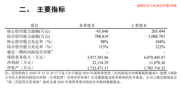 根据富德生命人寿保险公司2021年第1季度的偿还能力报告可知,其核心偿还能力充足率和综合偿还能力充足率分别为98%、115%,都过了及格线,也就是说人家的赔付能力还是有的。