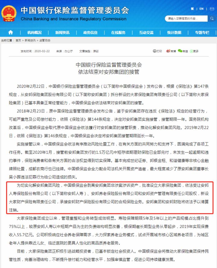 可以发现的是,虽然安邦集团不存在了,但是银保监会又重新组织成立了大家保险公司——来承接安邦集团的所有合规保险业务。
