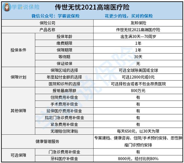 废话少说,学姐先行为大家奉上友邦传世无忧2021高端医疗险的保障精华图: