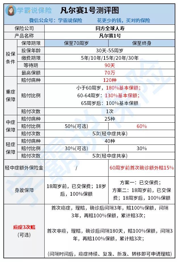对比市面上那些单次赔付型重疾险,但每次只赔付100%基本保额的产品来讲,凡尔赛1号重疾险的重疾保障力度很优秀了!