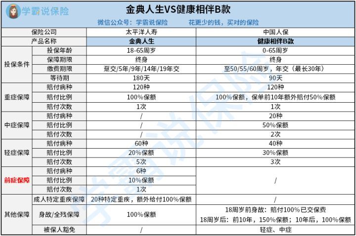 为了让大家更清楚两家保险公司的重疾险情况,学姐这里挑选了它们各自旗下热卖的产品进行对比:太平洋人寿的金典人生和中国人保的健康相伴B款。