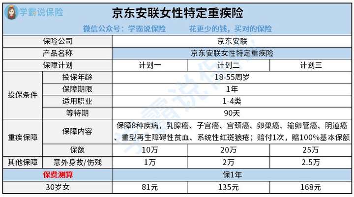 但是因为京东安联女性特定疾病保险短期险的特性,比较适合拿来当做暂时的保障,或者配合长期重疾险来提高保额,要是想要持久稳定的保障,还是得另外择优投保。