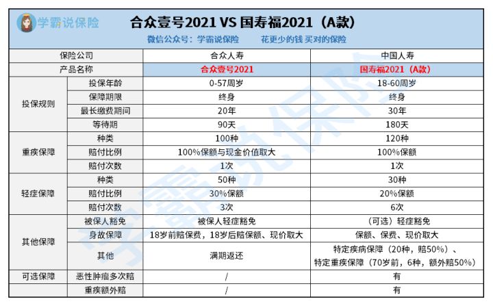 学姐分别选取了两家公司的当红重疾险——国寿福2021(A款)与合众壹号2021来做PK,具体对比情况如下: