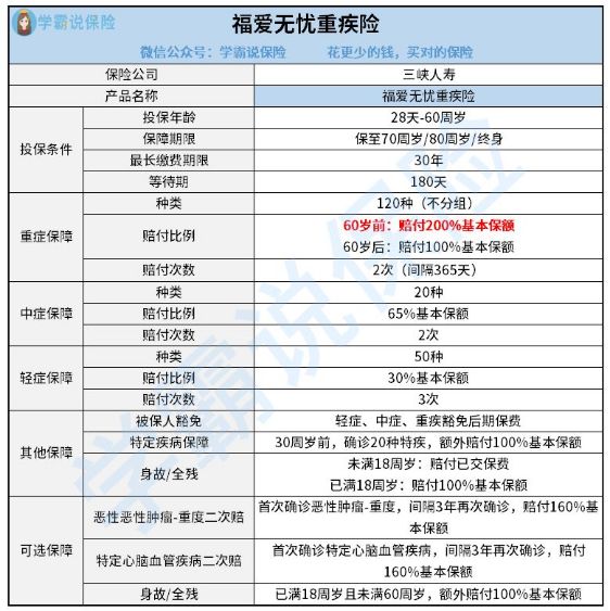 三峡福爱无忧重疾险规定了,如果被保人在60岁前不幸罹患上重疾,即可赔付200%的基本保额。