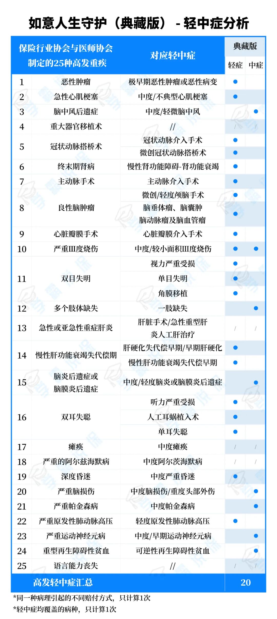 如意人生守护系列,不论英雄版还是典藏版,都是中症保25种、轻症保50种。