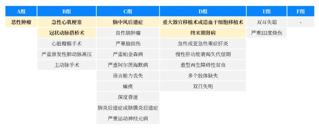 分组情况上,和早前的英雄榜基本一致,25种高发重疾分散在B-F的5个组别里。
