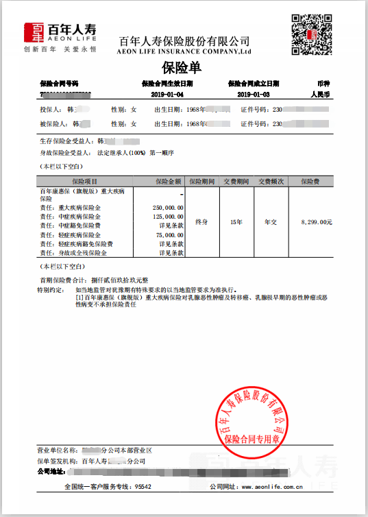这次理赔的客户——韩女士,去年(2019年)1月3日,在学霸说保专家的建议下,投保了一份百年人寿·康惠保(旗舰版)重大疾病保险。