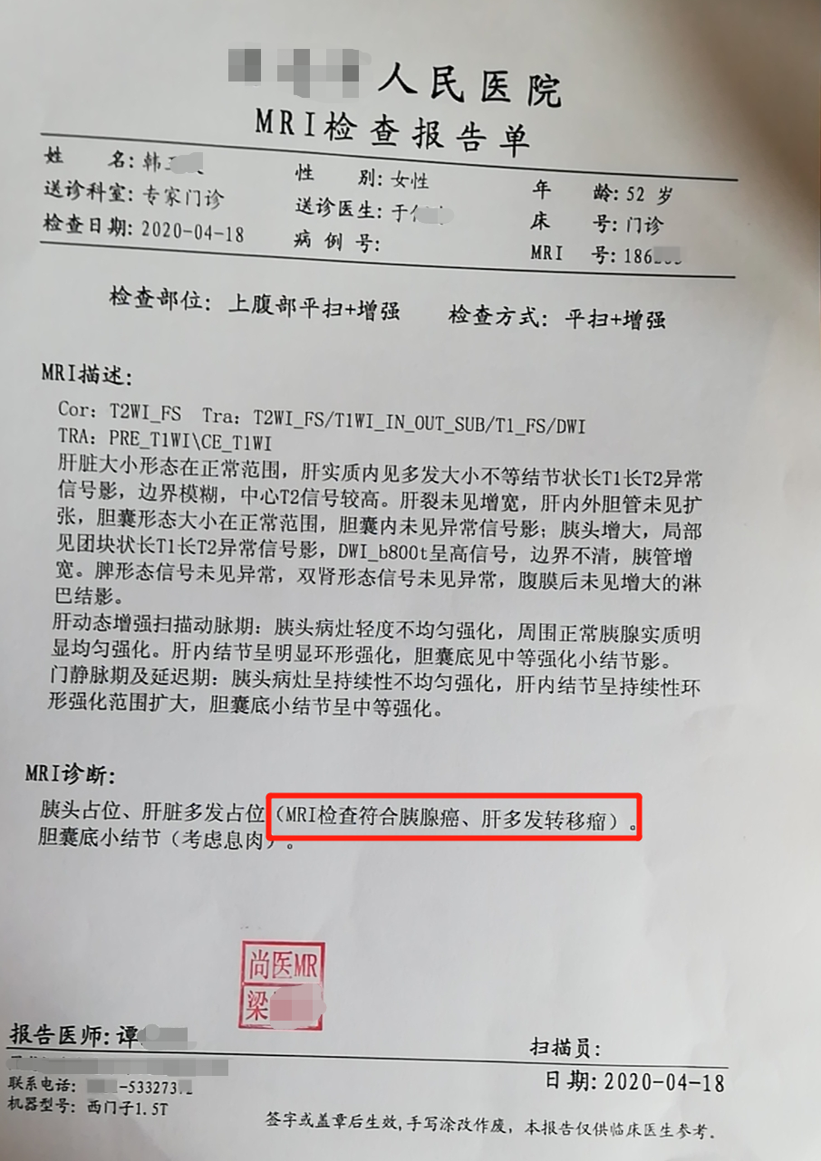 2020年4月18日中午,学霸说保的客服接到韩女士的电话,韩女士在当地市人民医院做了MRI检测,查出胰腺癌、肝多发转移瘤。