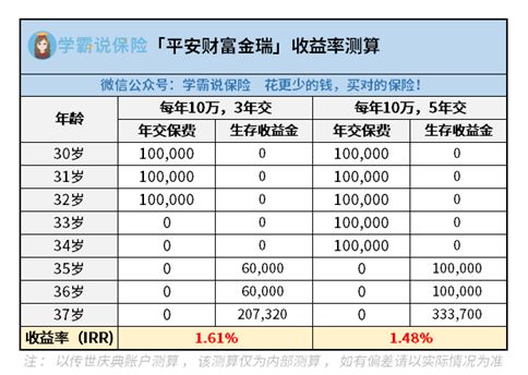以3年交费为例,你总共往保险公司存了30万,存7年,保险公司给你的年利率只有1.61%。5年交费的利率更低,只有1.48%。