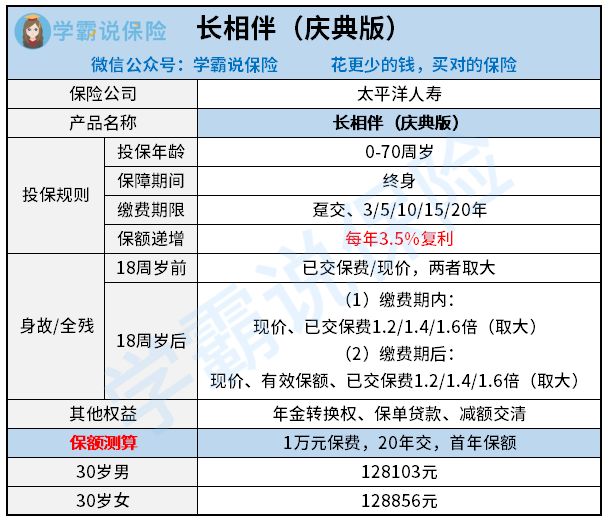 一、长相伴庆典版增额终身寿险的保障好不好?长相伴庆典版增额终身寿险是太平洋保险的产品,好不好还得看过才知道。学姐为了让大家更好地了解长相伴庆典版增额终身寿险,将它的基础形态整理了出来: