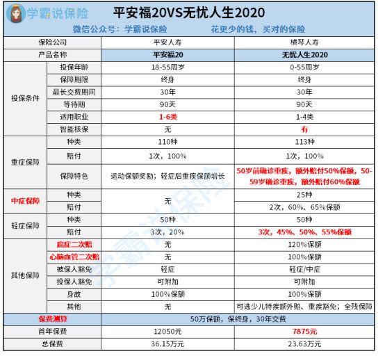 简单说说战况的情况:与平安福20相比,无忧人生2020可以说是完胜。不仅保障更全,而且更便宜,平安福20每年的保费要一万多,无忧人生2020首年保费8千都不到!