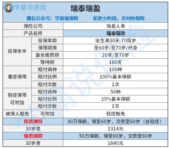 其中保障够用、价格便宜的重疾险还是有的,咱们先以瑞泰瑞盈为例来说说: