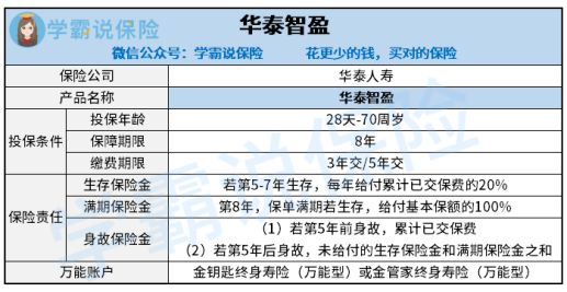 华泰智盈保障8年,前5年强制存款,第5、6、7年每年返还20%已交保费作为生存年金,到第8年保障期满之后可获得100%基本保额作为满期保险金。