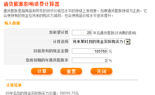 我们国家每年公布的通货膨胀率都在3%左右,下面我们来计算一下,本金+收益的105760元在20年后还值多少钱:
