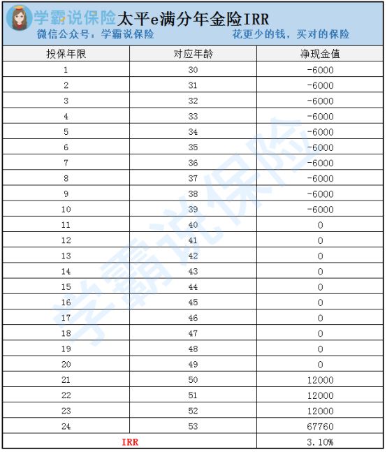 要知道,市面上大多数年金险的IRR利率基本上都有3%-3.5%,因此太平e满分年金险的IRR计算得出有3.1%,算是中规中矩!
