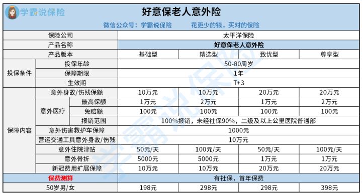 虽然亮点确实是很多,但是学姐也不得不泼下冷水,好意保老人意外险的保费是比较贵的,相比起一般几十块钱一年的保险来说,好意保老人意外险最低也要198元一年,但是这保障内容,确实是值这个价,想要投保这款的朋友,可以看看这份对比表,看看好意保老人意外险处于市场什么位置: