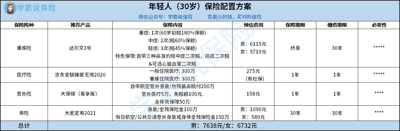 我以30岁的年轻人为例,制作了下方这份保险配置方案: