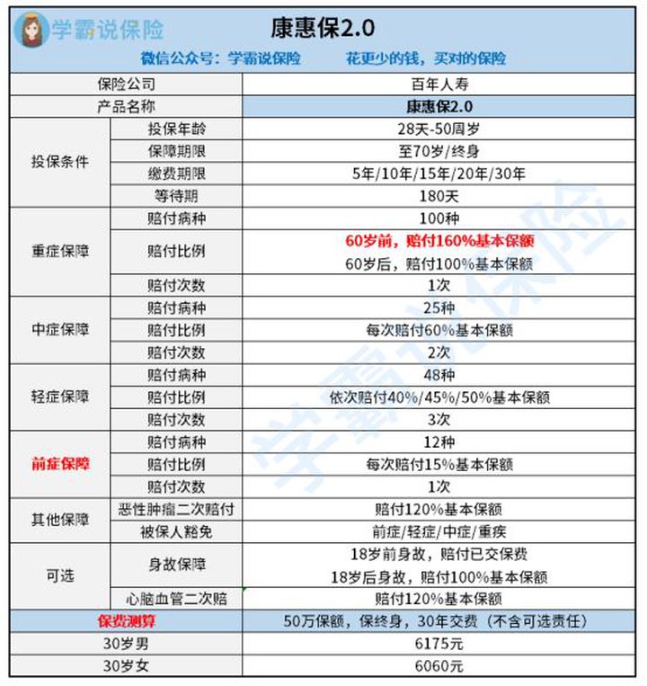 除了康惠保3.0的前身-康惠保2.0,百年人寿的百惠保也有前症保障,大家也可以了解一下: